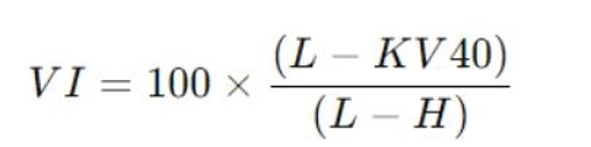 4. اعمال فرمول محاسبه VI: پس از تعیین L و H، شاخص ویسکوزیته با استفاده از فرمول خاصی محاسبه میشود. برای روانکارهایی که KV100 آنها کمتر یا مساوی cSt 70 است، فرمول به شرح زیر است: