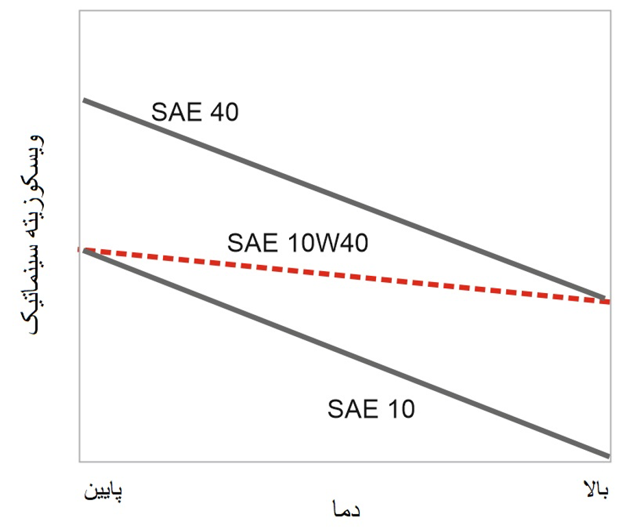 در این شکل، دو روغن تک درجهای را نشان میدهد که برای استفاده در موتورهای خودروهای جادهای طراحی شدهاند. SAE 10 در مقایسه با SAE 40، ویسکوزیته کمتری در دماهای پایین دارد. به طور کلی، اولی برای شرایط سرد مناسب است: به آن روغن “زمستانی” میگویند. از سوی دیگر، SAE 40 برای شرایط گرمتر در نظر گرفته شده است که به عنوان روغن “تابستانی” شناخته میشود. با ترکیب بهبود دهندههای شاخص ویسکوزیته (همراه با سایر افزودنیها) در SAE 10، میتوان یک روغن چند درجهای ایجاد کرد که هر دو ویژگی را با هم ترکیب میکند: SAE 10W-40. این روغن چند درجهای دارای ویژگیهای هر دو است: قابلیت پمپاژ عالی SAE 10 در دماهای پایین و یک لایه روغن متراکمتر و پایدارتر در دماهای بالاتر SAE 40. استفاده از روغن چند درجهای، لزوم تعویض روغن موتور با تغییر فصل را از بین میبرد.
