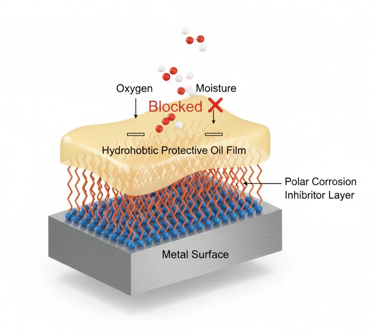 What Is Protective Oil? Protective oils function through a synergistic combination of physical barrier formation and chemical inhibition mechanisms. Base oils provide hydrophobic isolation, while specialized additives actively interact with the metal surface to suppress electrochemical corrosion reactions. Additive chemistry, formulation strategy, and correct classification enable protective oils to address a wide spectrum of corrosion challenges across industrial environments.
