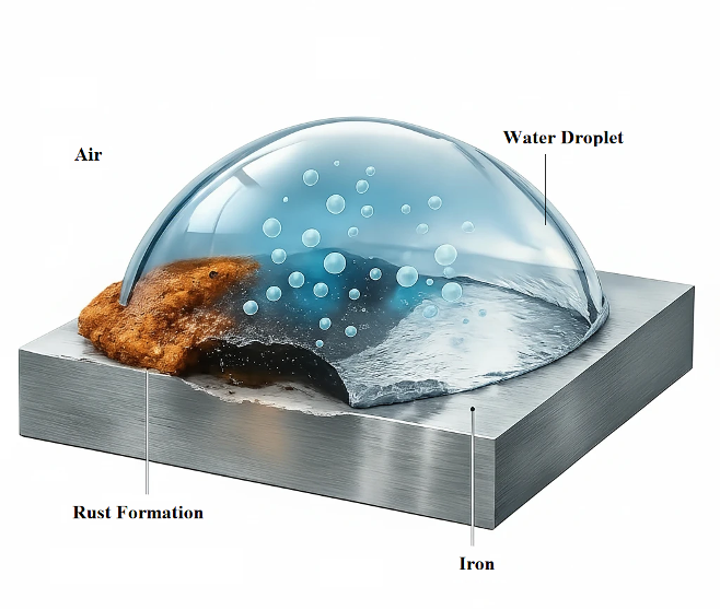 Moisture acts as an electrolyte by enabling ionic conductivity between anodic and cathodic areas. Dissolved salts, acids, and process residues significantly enhance electrolyte conductivity, accelerating corrosion rates. Even thin, invisible moisture films are sufficient to initiate localized corrosion, particularly under oil residues, fingerprints, or surface contaminants.